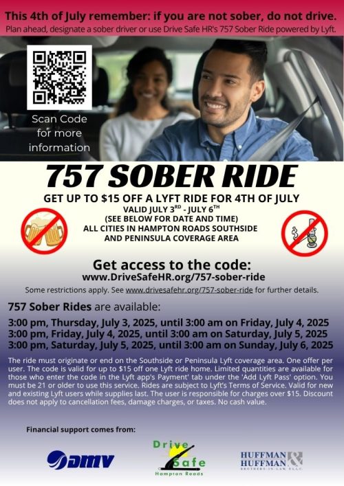 Supporters of the 2025 757 Sober Ride campaigns are Drive Safe Hampton Roads, Huffman & Huffman Brothers-in-Law, and the campaigns are funded in part by a grant from the Virginia Department of Motor Vehicles.
