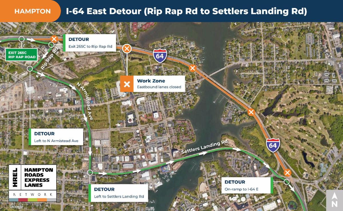 - I-64 East Full Closures: All lanes on I-64 east will be closed overnight starting as early as Wednesday, Dec. 17, and Thursday, Dec. 18, from 12:01 a.m. to 4 a.m., between Rip Rap Road and Settlers Landing Road/Woodland Road. Signed detours will be in place, directing motorists from I-64 east to exit at Rip Rap Road — exit 265C — and travel to North Armistead Avenue and Settlers Landing Road to access the on-ramp to I-64 east.
