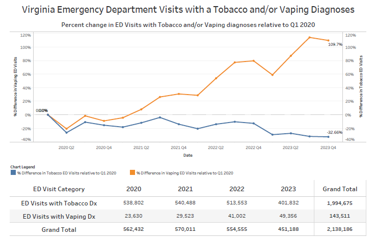 INNSBROOK — Emergency room visits in Virginia by people who reported vaping more than doubled between 2020 and 2023, according to a data analysis released this week by the Virginia Hospital & Healthcare Association.