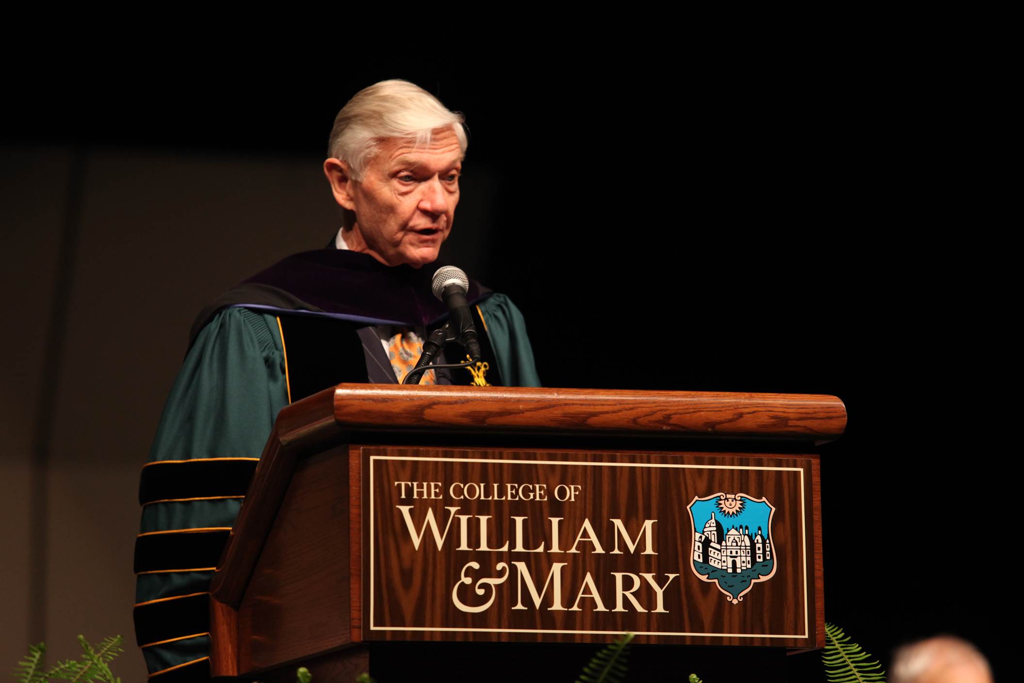 Reveley also spoke during the ceremony, saying the school has been “blessed with a constellation of humans of indomitable spirit and will to excel, who’ve had at times to prevail despite crushing odds.” He also said the school has “the brains of a big research university and the heart of a small liberal arts college.”