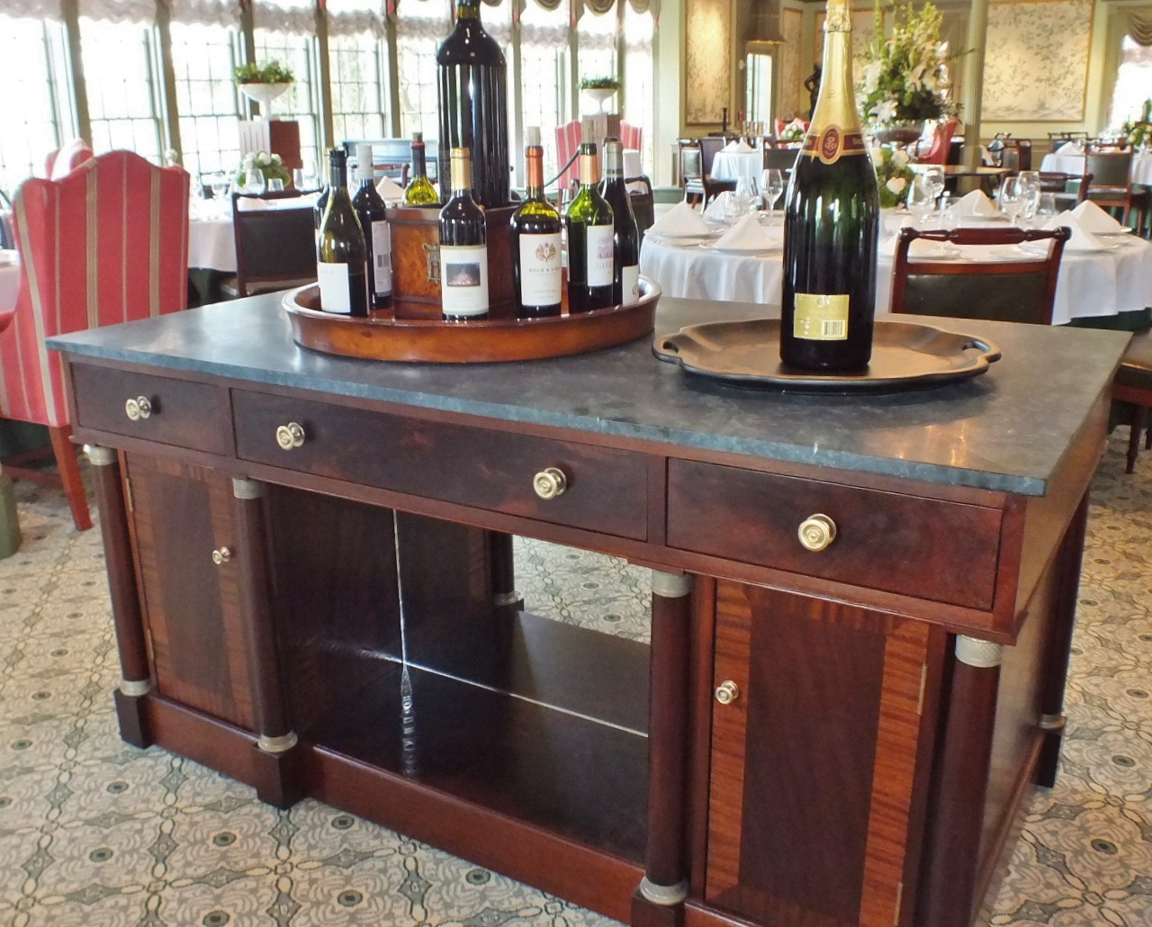 They will also be more elegant than skirted tables and at a more suitable height for food demonstrations and omelet-making when the Regency Room serves buffet breakfasts. Castors will allow them to roll out of the way if space is needed for larger functions.