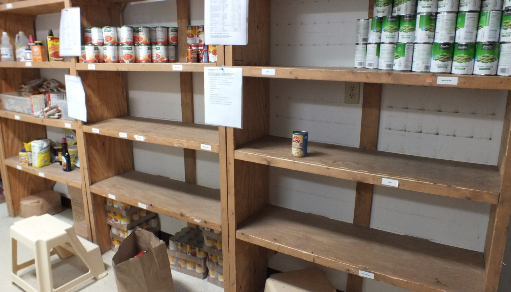 Labels remain to mark the empty shelves where columns of canned corn once towered in the FISH food pantry. Gaps between boxes clamor to be filled with the donations that did not come.