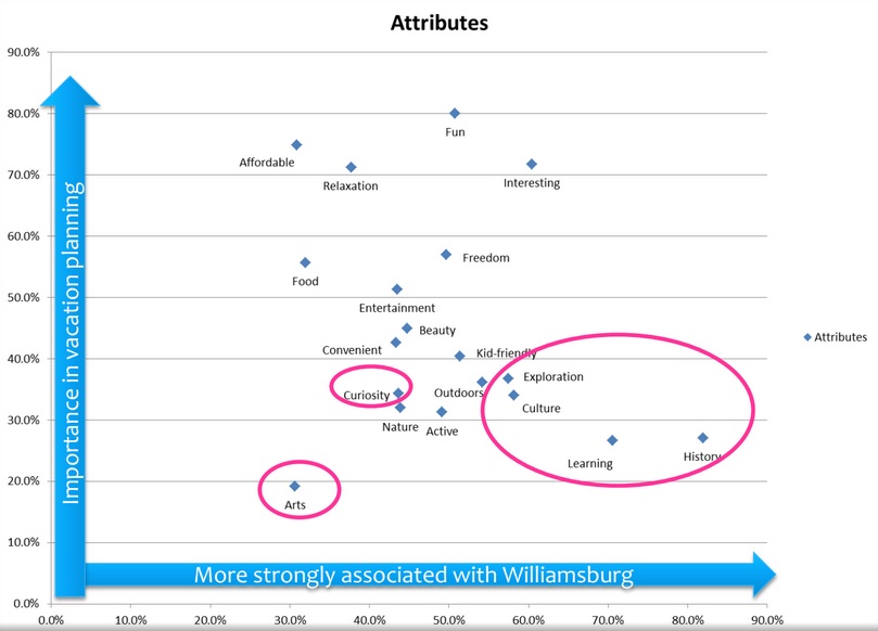 It also showed that almost 70 percent of respondents were either not at all likely or not very likely to visit. A destination’s arts, history and learning offerings were found to be the least important attributes in vacation planning, while affordable, relaxing, fun and interesting were the most important.
