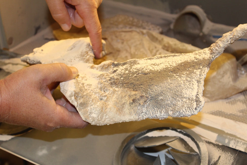 The straight edge along this piece of breastplate is a sign pieces of iron were cut off of the plate and recycled for other purposes, he said.