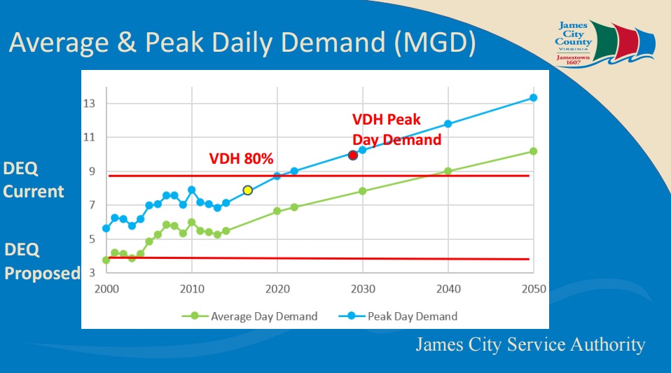 The JCSA’s water withdrawal is also regulated by the Virginia Department of Health, which issues a permit based on peak day demand. Powell said the county could reach 80 percent of its permit level as early as next year, an “early warning” the county needs to start looking for another source of water.