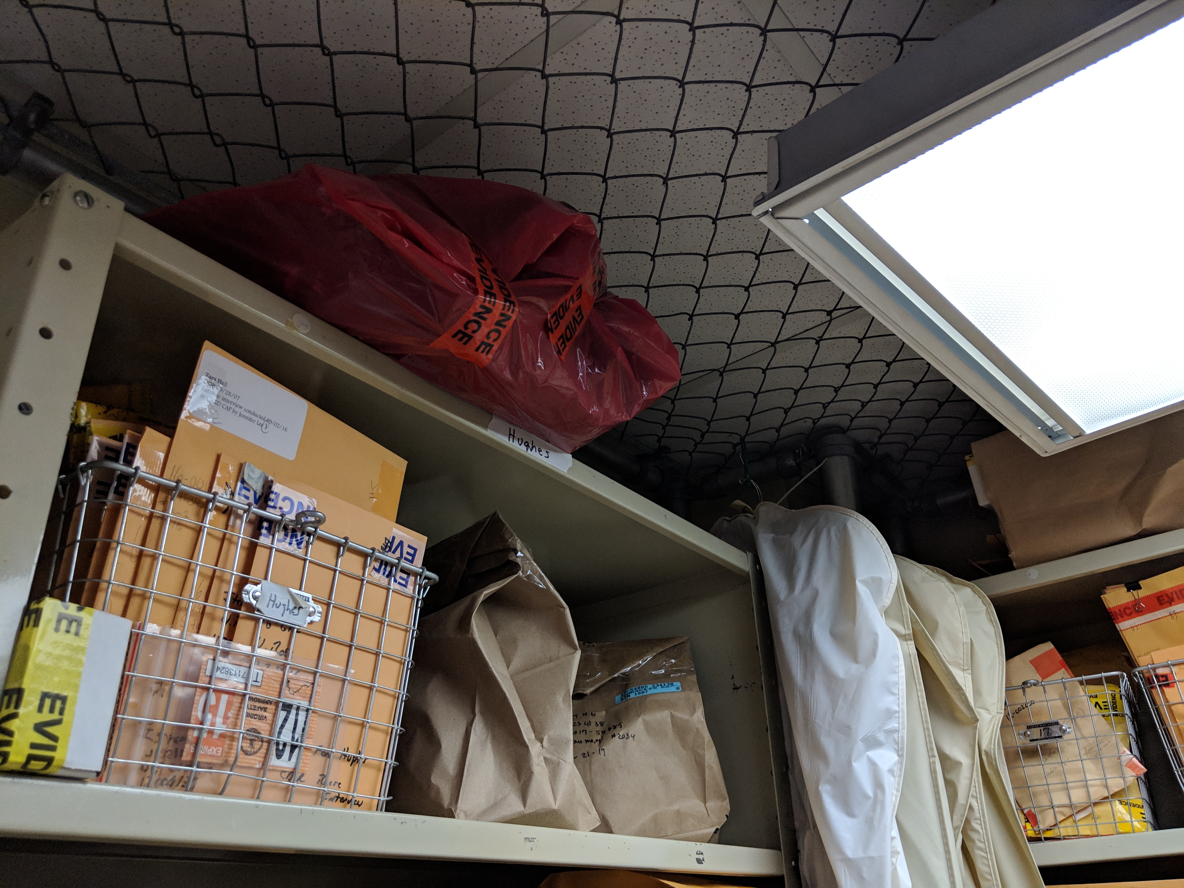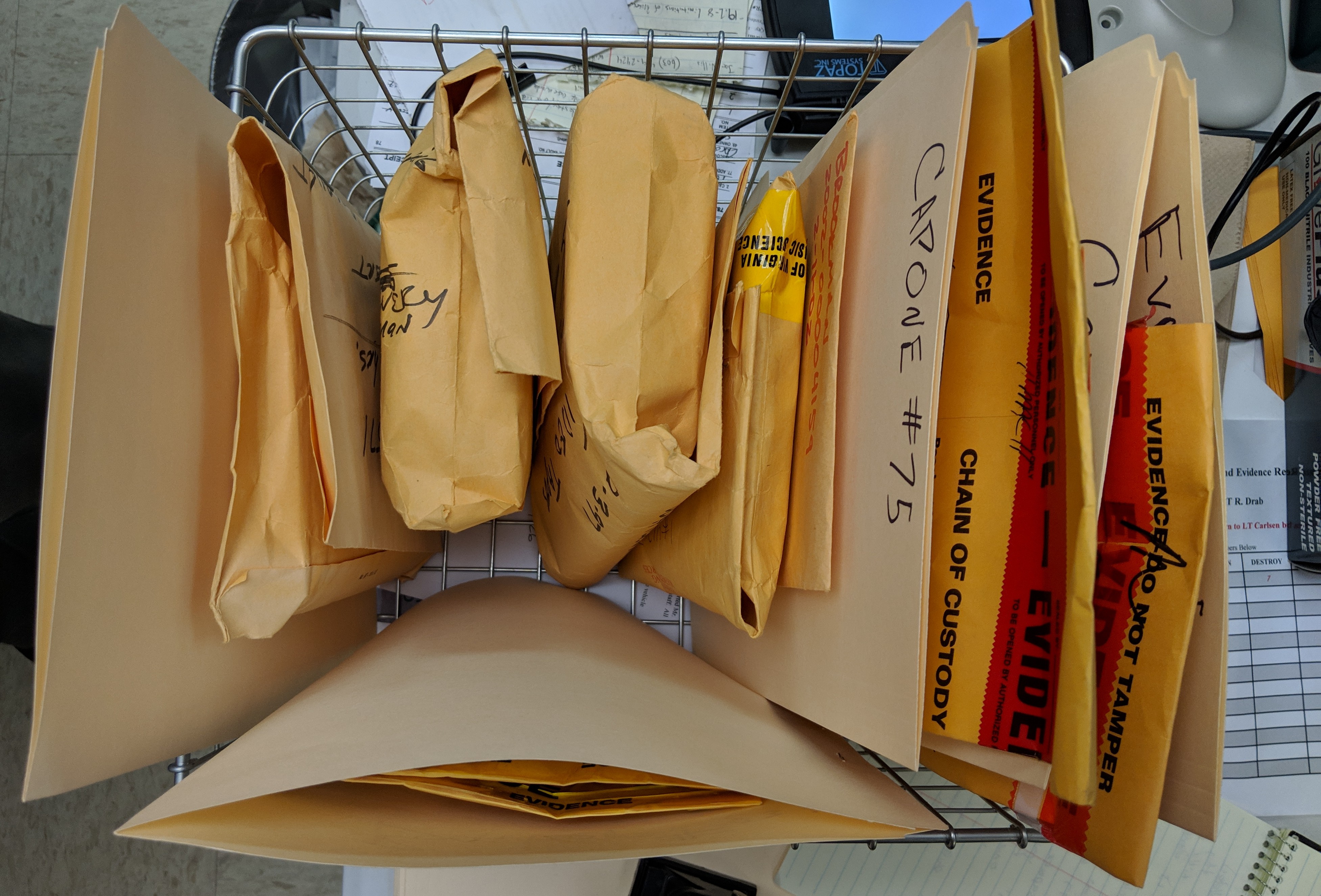On Tuesday, Investigator Mark Mahoney entered the evidence room, referencing a six-digit property receipt number. Carlsen scanned the shelves, eventually handing over a small package to Mahoney.