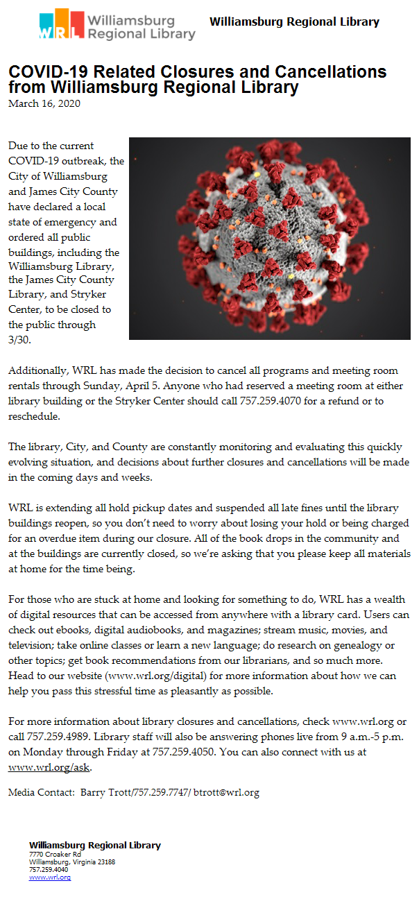 The Williamsburg Library, James City County Library, and Stryker Center are closed through March 30. Programs and meeting room rentals are cancelled through April 5.