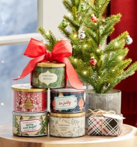 Your favorite holiday fragrances are available for a limited time in fun, giftable tumbler jars with embossed metal lids and colorful giftwrap-inspired labels bearing jolly holiday phrases.