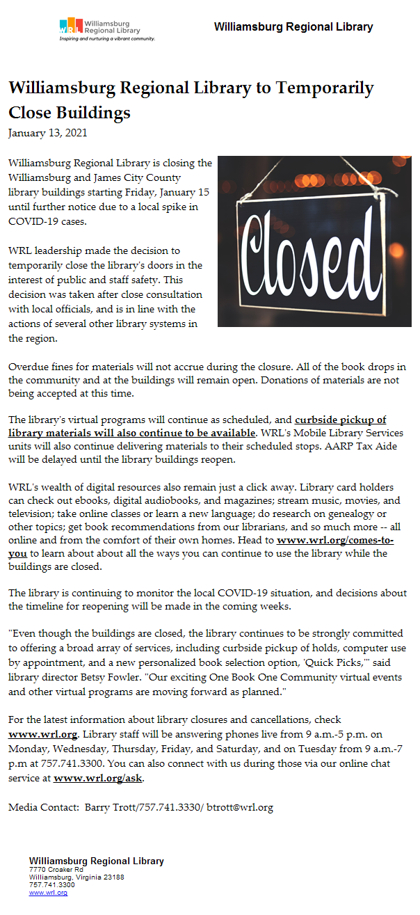 While the buildings will close temporarily, the book drop off locations at the libraries and throughout the community will remain open. In addition, the Williamsburg Regional Library will continue its virtual programs and curbside pickup service https://wrl.org/wrl-to-go/