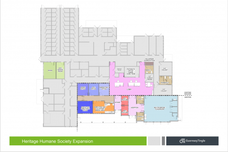 The $1.8M project will include the addition of 2550 square feet to the front of the adoption facility. It will also add more than 820 square feet for a multipurpose room, 16 new parking spaces and two outdoor dog play yards.