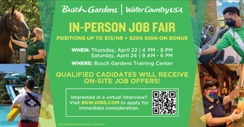 WILLIAMSBURG — Looking for a fun job? Busch Gardens Williamsburg and Water Country U.S.A. are hiring!