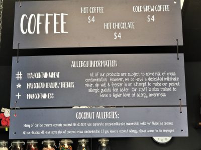The menu board shows the shop’s attention to detail and care for their customers’ health. Icons are used to let customers know which flavors and treats may contain certain allergens. My only disappointment was that there wasn’t really a selection for those of us who are lactose-intolerant or have a milk/dairy allergy.