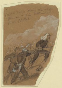Despite his enthusiastic display, this would prove fatal for the young captain. No sooner were the words uttered than he was shot by enemy fire. As his limp body fell onto the log from which he stood, fear of the reality of battle filled his men’s faces.