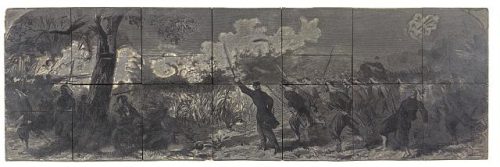 As Federal troops marched in the early morning light, the silence that surrounded the peaceful rural area exploded with artillery fire. The Union regiments raced into two nearby farmhouses and into a tree line. They were ordered to return fire, but to no avail. The only loss reported was that of one mule.