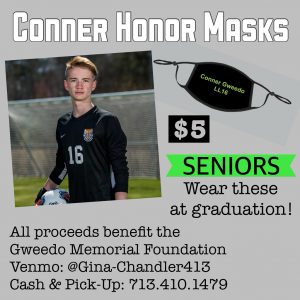 A friend of Conner’s since his days at Tabb Elementary School, Faith Geigley, designed a pin that every senior can wear on their gowns at graduation. She also designed a mask for the seniors and faculty to wear that says “Conner Gweedo LL 16” (Conner was known as “Gweedo” to his friends and soccer teammates.) Proceeds from the $5 mask will go towards the Conner Gweedo Memorial Foundation.