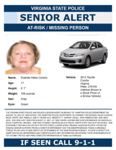 Carson was last seen on Aug. 21 at approximately 6:30 p.m. leaving her son’s residence located on Marcella Road in Hampton. She is reported has having worn a white shirt, black pants and slip-on shoes.