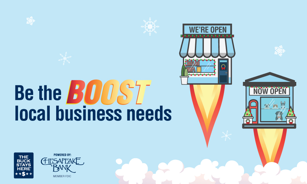 Also, be on the lookout for our Shop Local Boost Pop Ups! We’ll have $50 Chesapeake Bank Visa Gift cards that you can purchase for just $25 – doubling the dollars you can spend with local businesses so the Buck Stays Here! Limit 2 gift cards per household.