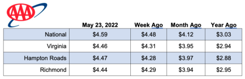 Locally, Virginia’s average pump price jumped 15 cents to $4.46. In Hampton Roads, prices increased 19 cents to $4.47, which is 50 cents higher than last month and $1.59 higher than a year ago.