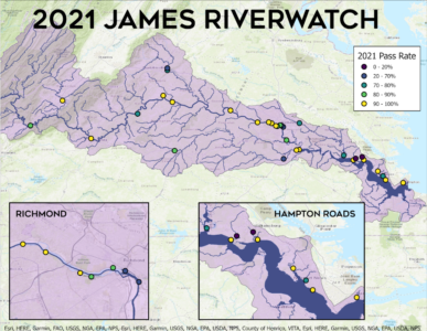 During the 2021 river season, James River Watch reported an 83% pass rate, with nine sites passing 100% of the time. These sites included the Scottsville Boat Ramp, Tucker Park at Maidens Crossing, Robious Landing, Pony Pasture, Hopewell at Route 10, Jamestown Beach, College Creek Beach, Riverside Beach, and Hampton Marina.