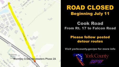 Cook Road will be closed from Route 17 to Falcon Road, the county said in a press release. Detour signs will be posted identifying alternate routes for drivers. The county assured access will be maintained to all private entrances within the section of the roadway.