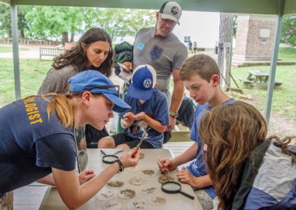Activities include sorting through 17th-century food remains like oyster shells to discover what people ate on the island, using advanced geographic technology to map archaeological features, identifying artifacts, and more. Visitors can touch and examine projectile points, beads, wine bottle glass, pipe stems, and European and Virginia Indian ceramics, all excavated from Jamestown Island.