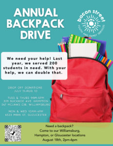 WILLIAMSBURG — Bacon Street Youth and Family Services will be collecting backpacks for its Third Annual Backpack Drive from July 11 to Aug. 10 at its Hampton, Gloucester, and Williamsburg offices.