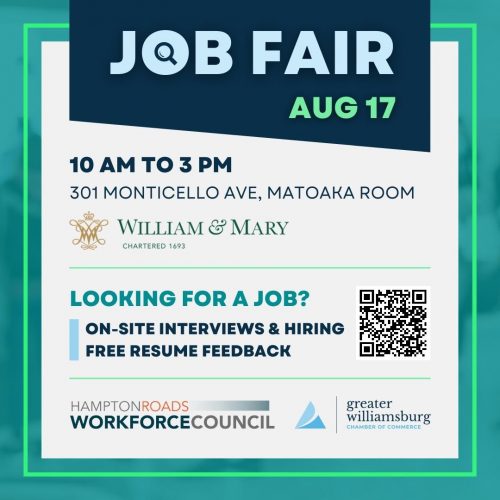 The Chamber will host its 2022 Job Fair in partnership with the Hampton Roads Workforce Council on Wednesday, August 17th from 10 AM to 3 PM. The Job Fair will take place in the William & Mary School of Education Matoaka Room, located at 301 Monticello Avenue. There are over 1,000 local job opportunities available at this event, with many employers conducting on-site interviews for on-the-spot hiring. Job seekers can register online.