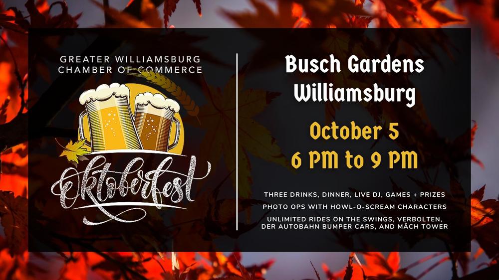 The Chamber is proud to present its annual Night of Oktoberfest at Busch Gardens Williamsburg from 6 PM to 9 PM on Wednesday, October 5th, 2022. Purchase tickets for a fun evening of networking, food, drinks, rides, games, prizes, a live DJ, and photo ops with strolling Howl-O-Scream characters. Early bird tickets and group discounts are available online through September 1 at 5 PM.