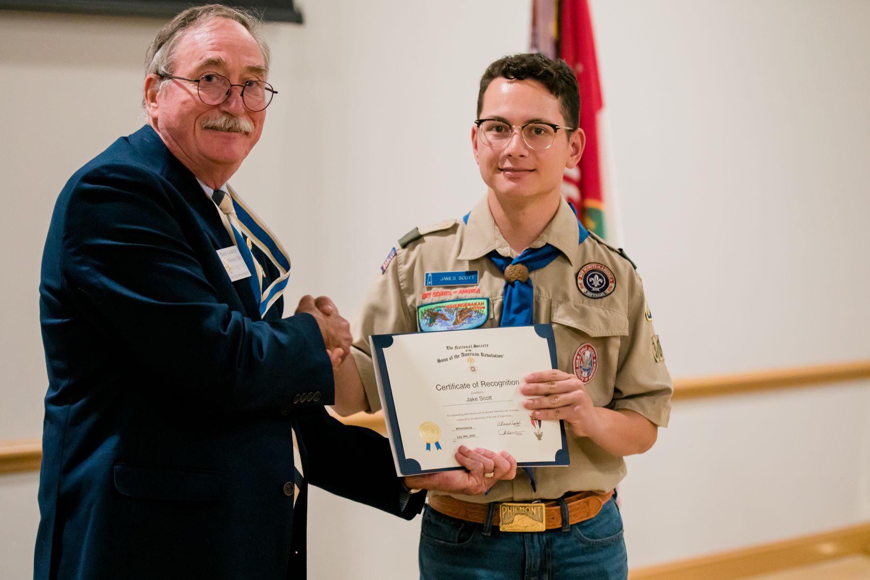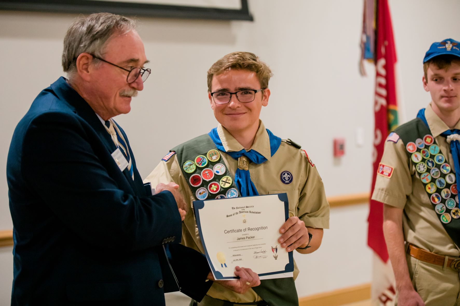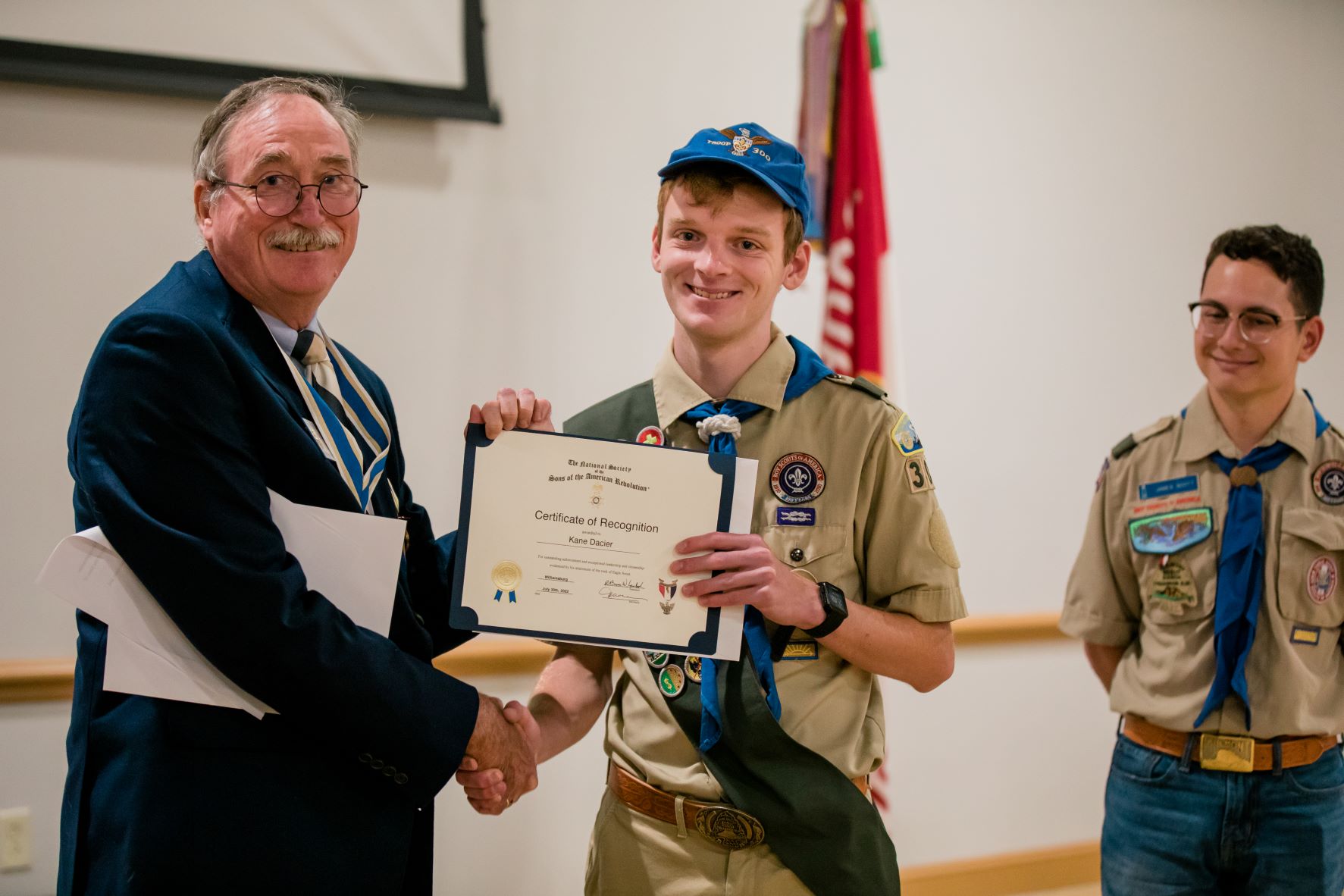 Laubach also presented SAR Certificates of Recognition to Jake Scott, Kane Dacier and James Packer, who each received the rank of Eagle Scout at their Court or honor Troop 300 Eagle Scout Court of Honor on July 30.