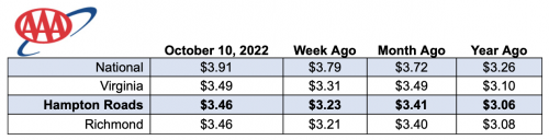 Prices also increased locally, landing at $3.49 — 18 cents higher than a week ago and the same price as a month ago. In Hampton Roads, prices increased 23 cents to $3.46, five cents higher than a month ago and 40 cents higher than a year ago.