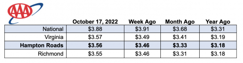 Prices across the commonwealth increased to $3.57, eight cents higher than a week ago and 16 cents higher than a month ago. In Hampton Roads, prices increased ten cents to $3.56, 23 cents higher than last month and 38 cents higher than a year ago.