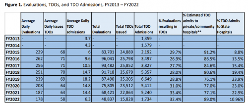 Since 2014, TDO admissions to state hospitals have been spiking, with one state report from the past June finding a 389% rise between fiscal years 2013 and 2019.