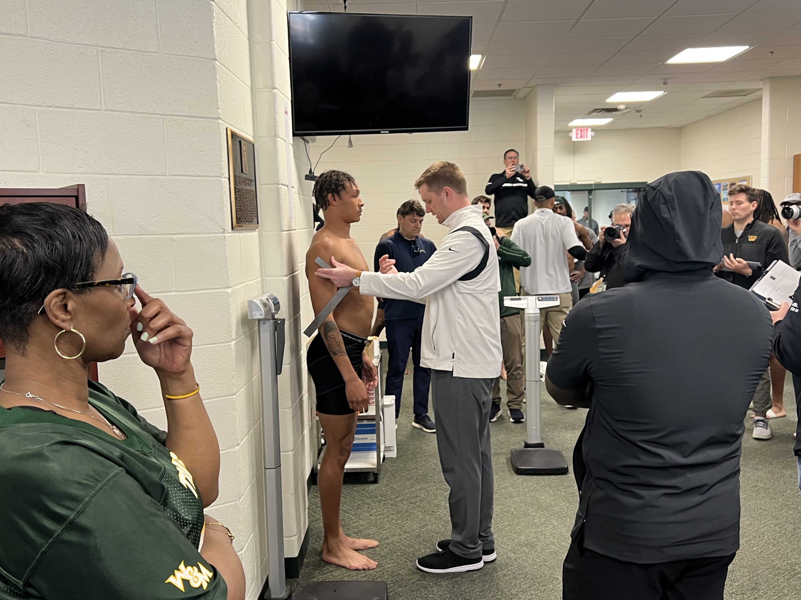 The day started off with official measurements, followed by a round of the bench press. Cameras were clicking away as each athlete worked at putting their best foot forward for the scouts.