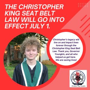 Reflecting on the accomplishment of the Christopher King Seat Belt Bill going into effect three days before the anniversary of Christopher’s death, Christy feels thankful.
