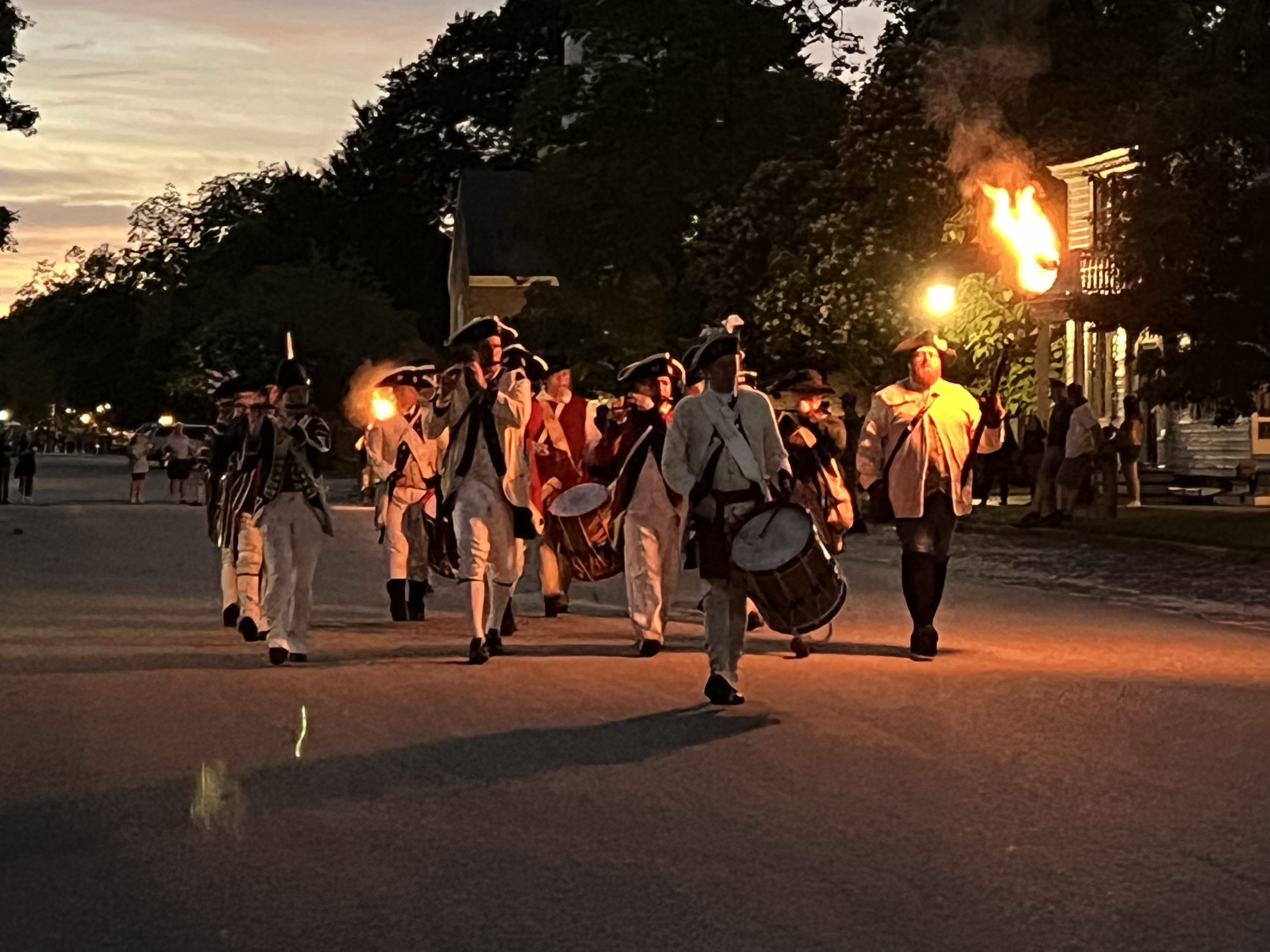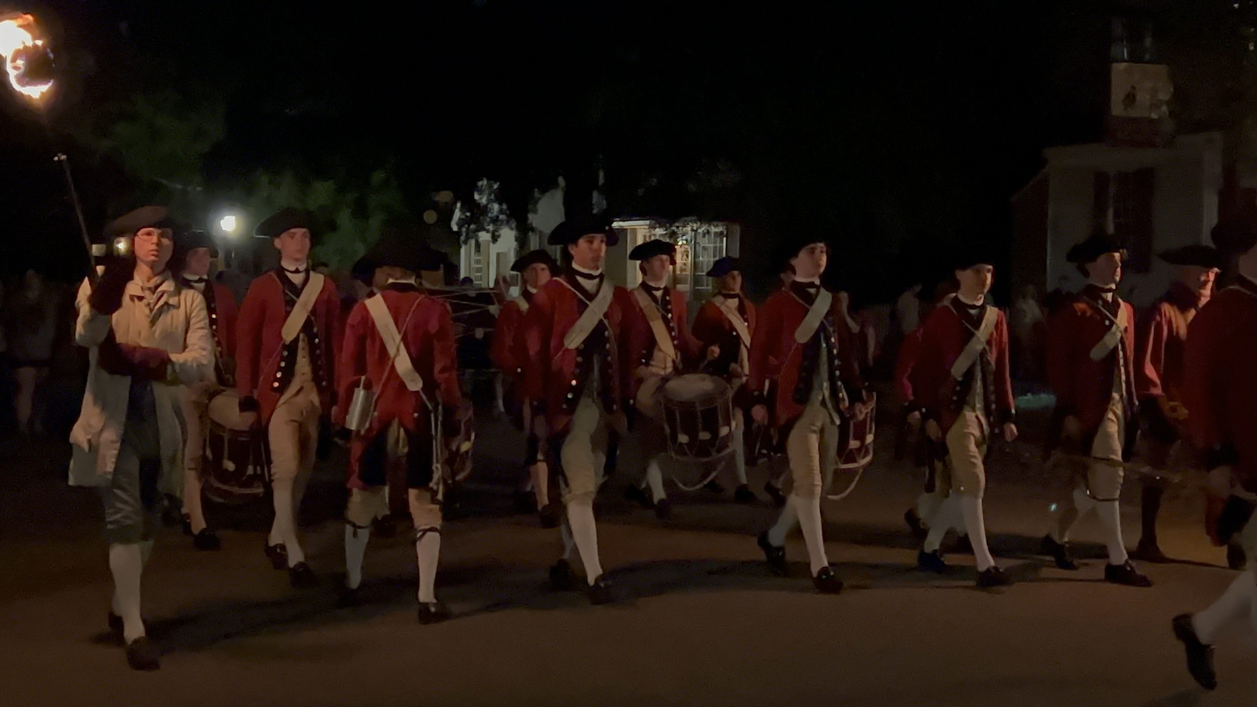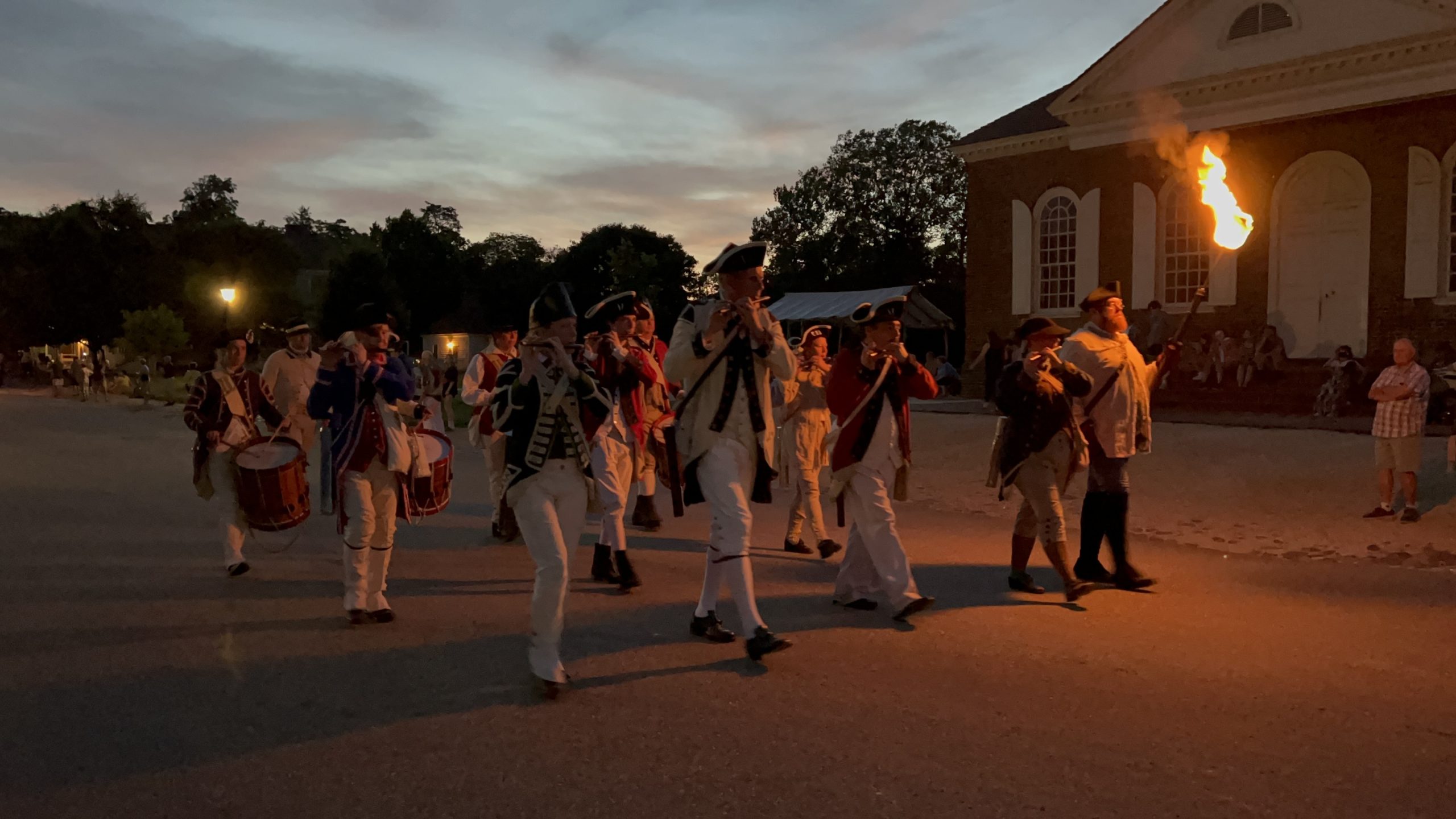 On May 17, visiting groups along with the Colonial Williamsburg Fifes and Drums participated in a torchlit march down Duke of Gloucester Street. The groups played 18th-century field music as they marched from the Palace Green to the Capitol during the parade.
