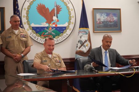 YORKTOWN — Capt. Dan Patrick, Commanding Officer of Naval Weapons Station (NWS) Yorktown and Dominion Energy Virginia’s President, Edward Baine convened Friday morning onboard the installation for a historic Memorandum of Agreement (MOA) signing.