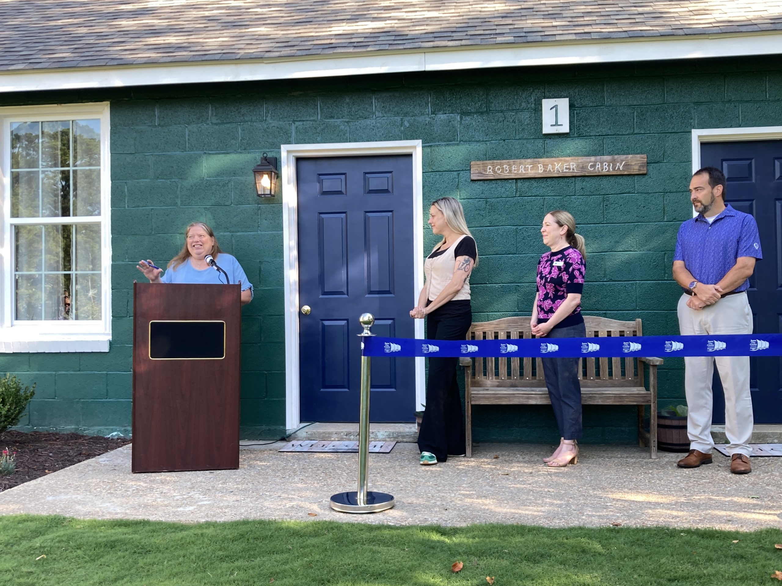 Lauren Moore from the Greater Williamsburg Chamber of Commerce opened the event, expressing her personal excitement about the reopening of the cabin, “I’m very excited to be here celebrating the Jamestown 4-H Education Center, the reopening of cabin one. Jamestown 4-H has been serving our community for nearly 100 years, and they have served so many youth in our community, including my son. This is now his special place. So I’m so excited to celebrate it.”