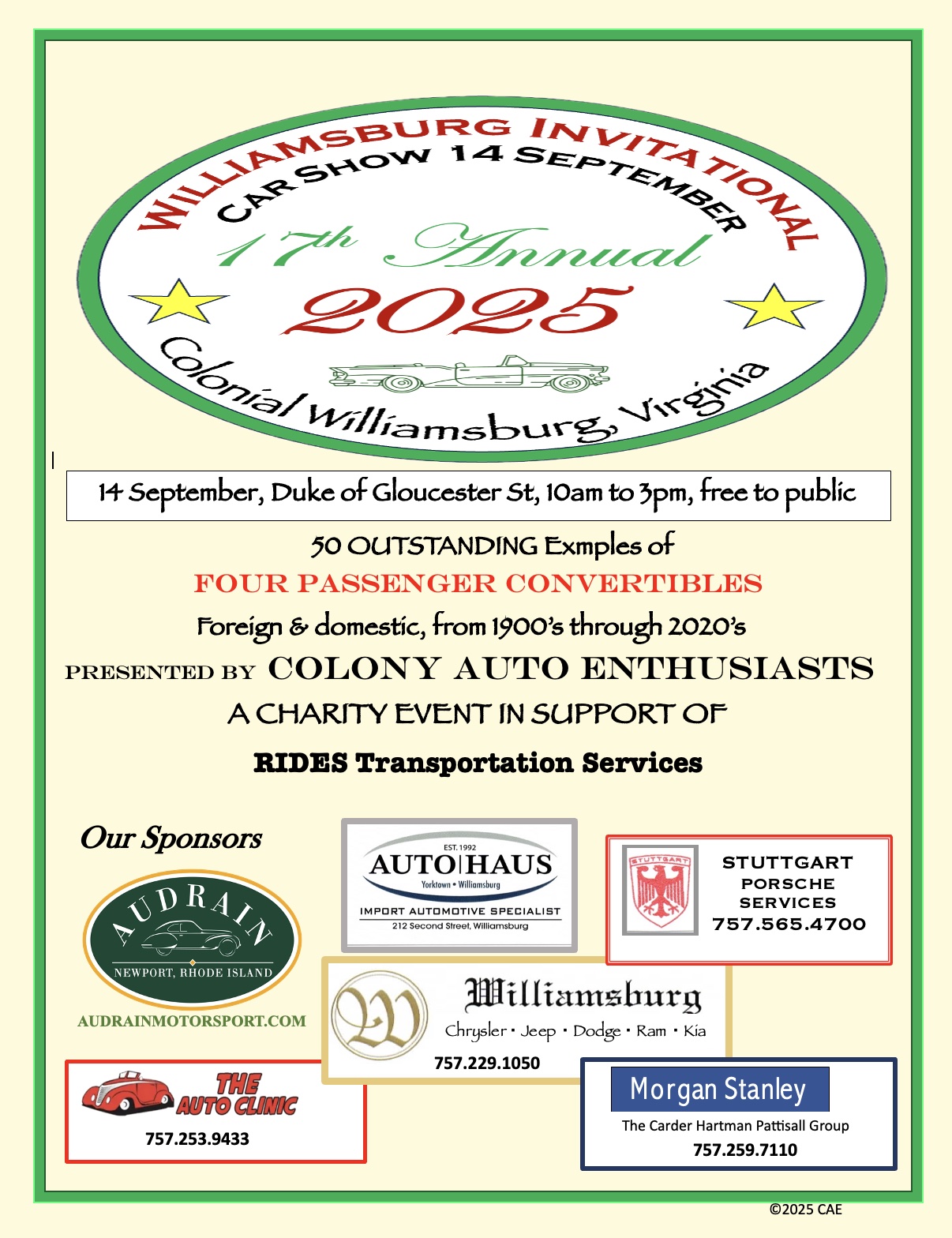 WILLIAMSBURG — The Colony Auto Enthusiasts announced its 17th Annual Williamsburg Invitational Car Show will take place Sunday, Sept. 14, along Duke of Gloucester Street in Colonial Williamsburg.