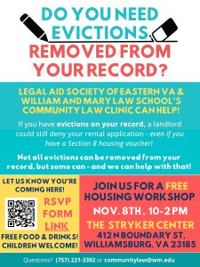 WILLIAMSBURG — Hampton Roads community members are invited to attend a Free Eviction Expungement and Housing Workshop, hosted by the recently launched Community Law Clinic at William & Mary Law School Saturday, Nov. 8.