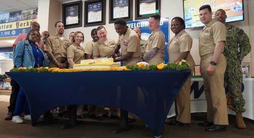 As the First Call to Colors echoed across the installation’s loudspeakers, the assembled Chiefs in-front of the headquarters building snapped to attention. As the first notes of the Francis Scott Key’s Star Spangled Banner filled the crisp morning air, a single, unified motion swept the assembled rank as the installation’s Command Master Chief Donavon Gray saluted as the flag was raised. The salute was smartly followed as each Chief rendered a crisp, unhesitating salute. For about a minute, time seemed to stand still as the National Anthem rang out. All eyes were fixed on the nation’s flag, raised proudly by Senior Chief Teresa Duson and Chief Hannah Jackson; assigned to the installation’s Scudder Hall Galley and Security Department respectively as it made its steady, deliberate ascent up the flagpole. This was a powerful symbol of freedom rising against the clear Virginia sky. The celebration also continued with a side of cake at lunchtime, when members of the installation’s Chief Mess both past and present gathered at the galley for a special cake cutting.