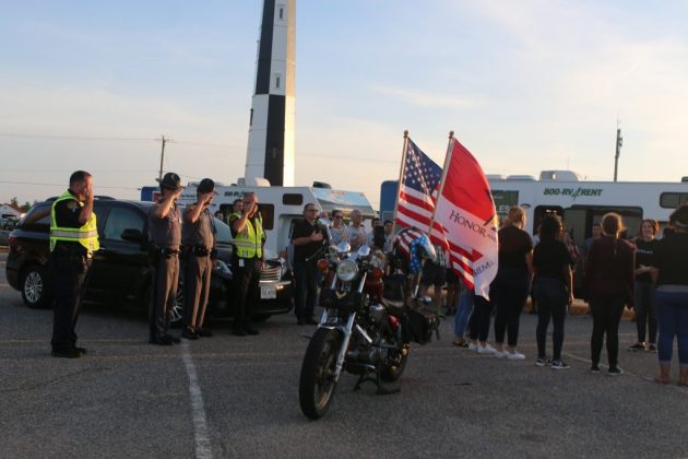 At each mile marker, the participating runners read the names of the heroes, what branch of service each served, and of each service member’s death. After all of the names are read, a salute is called. Runners will carry and place flags before paying respect to waiting family members.