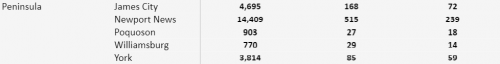 The latest numbers for the Peninsula Health District, which includes the Historic Triangle, are below, courtesy of the Virginia Department of Health’s (VDH) COVID-19 Dashboard: