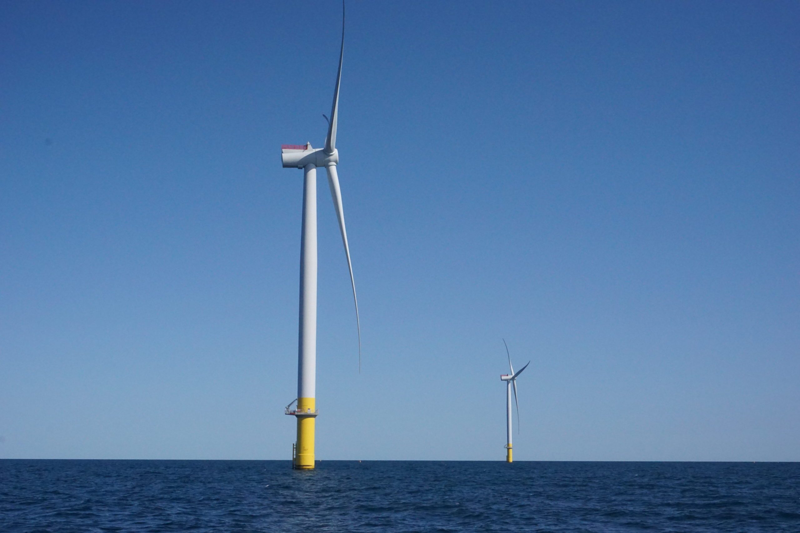 Two offshore wind turbines extend out of the Atlantic, standing at approximately 620 feet in height, with their propellers outstretched and slightly curved, almost resembling the arms of a starfish.