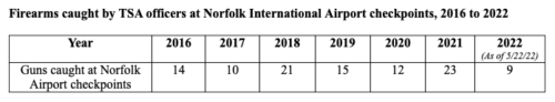 TSA officers detected 23 guns at Norfolk International Airport at the checkpoints in 2021. Last year, 5,972 firearms were caught at airport security checkpoints nationwide. Eighty-six percent of those guns were loaded.