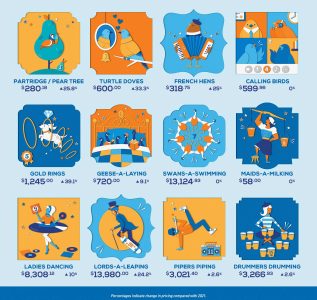 PNC’s 39th annual Christmas Price Index, a light-hearted take on the Bureau of Labor Statistics’ Consumer Price Index, measures the average change in prices consumers should expect to pay for the gifts outlined in the well-known holiday song. This year, the price of those gifts is up 10.5%, the third highest year-over-year increase in the index’s history.