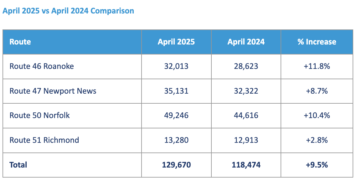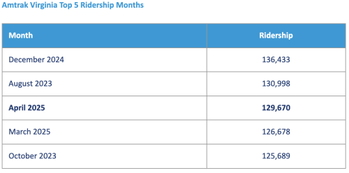 April ridership was also the third-highest monthly ridership ever recorded on Amtrak Virginia. It followed a strong March, which was also in the top five.