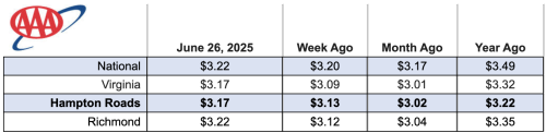 Locally, the gas price average for the Commonwealth Thursday was $3.17 — eight cents higher than a week ago and 16 cents higher than a month ago. In Hampton Roads, prices increased four cents to $3.17, which is 15 cents higher than a month ago and five cents lower than a year ago.