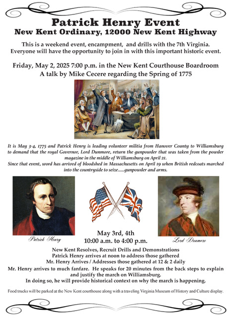 At 10 a.m. Saturday and Sunday, May 3 and 4, the encampment opens with reenactors and their horses at The New Kent Ordinary at 12000 New Kent Highway. The New Kent Resolves will be adopted at 11 a.m., followed by a military drill and demonstration. Patrick Henry arrives at noon to address those gathered, providing historical context for the march, followed by a drill, demonstration and recruitment. This will be repeated at 2 p.m. and the Camp will close at 4 p.m.