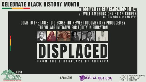 “We are honored to collaborate with the Village Initiative and Williamsburg Christian Church to host “Displaced from the Birthplace of America” for our annual Black History Month program.” said Laura Hill, Executive Director of the Virginia Racial Healing Institute. This story mirrors what happened in thriving Black communities nationwide.”