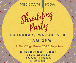 The Midtown Row Shredding Party is scheduled to take place on Saturday, March 19 from 11 a.m. to 2 p.m. at the Midtown Row Village Green, 200 College Row.